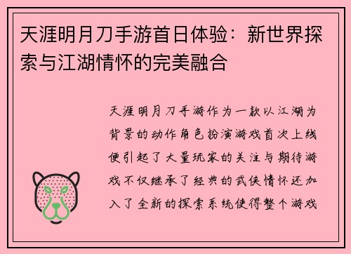 天涯明月刀手游首日体验:新世界探索与江湖情怀的完美融合